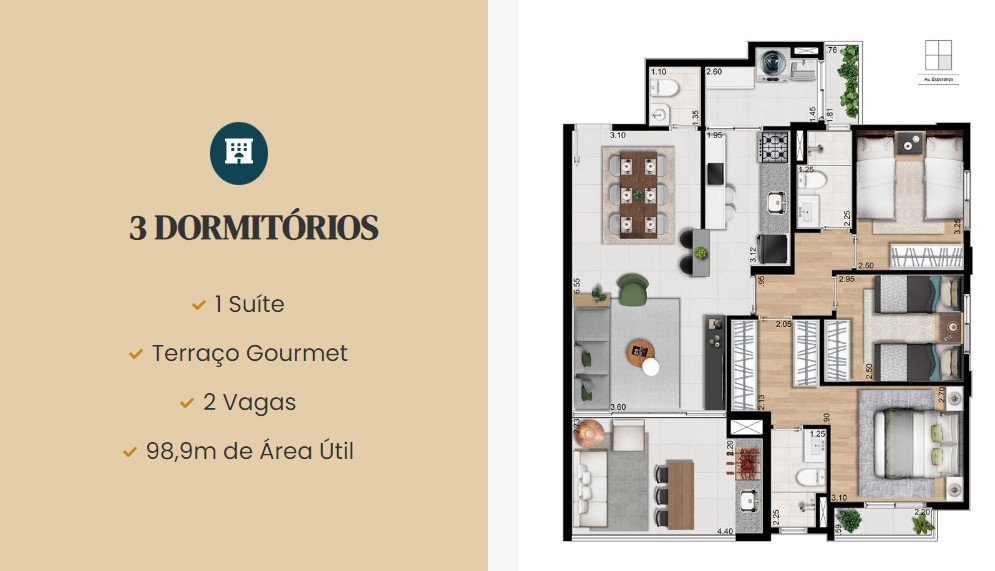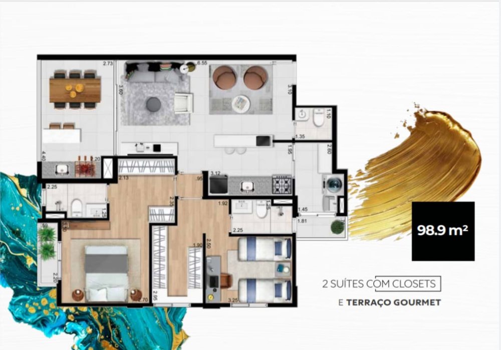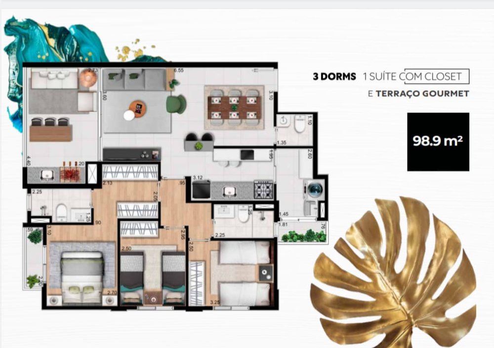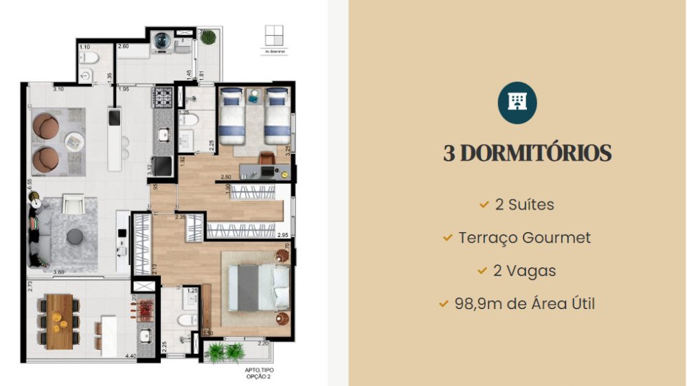 - 03 dormitórios, sendo 1 suíte com closet, terraço gourmet, lavabo e 2 vagas de garagem;