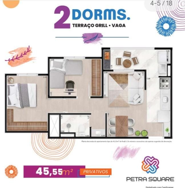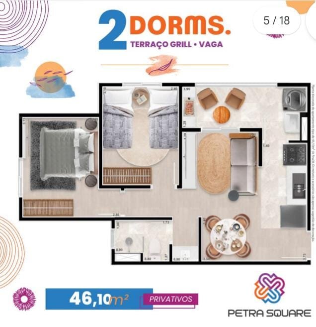 Apartamentos de 45 e 46 m² com 2 dormitórios sendo, varanda gourmet e vaga de carro coberta e livre.