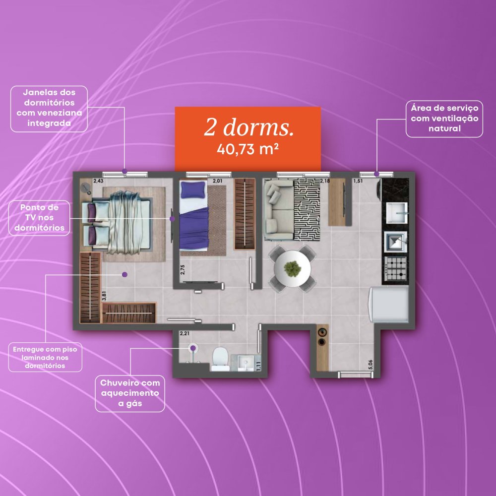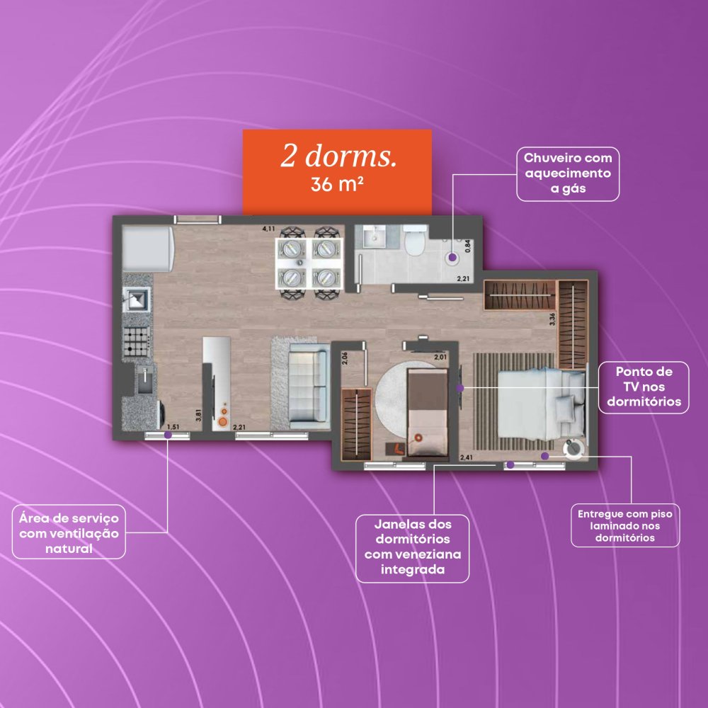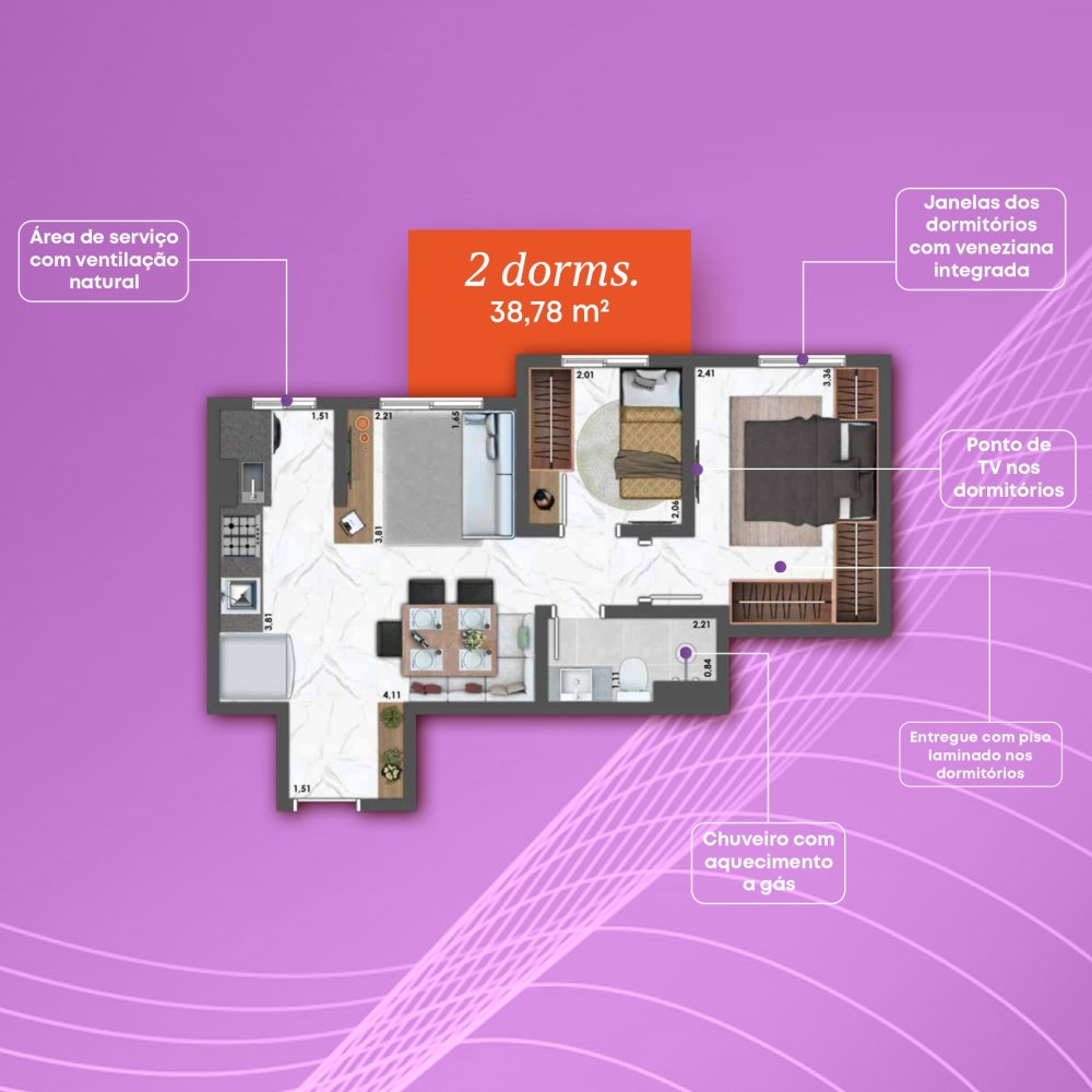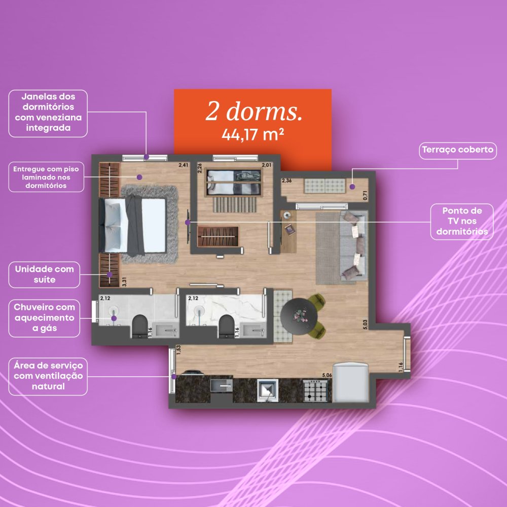 - Área Privativa: 44 m²